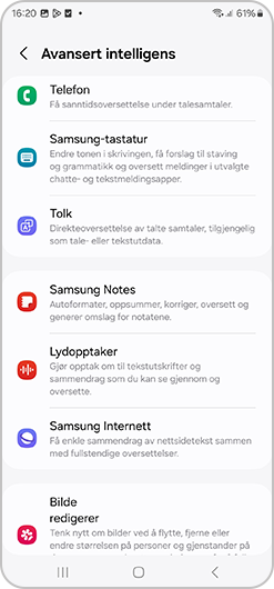 Galaxy AI-funksjoner bruker kraftig maskinlæringsteknologi for å gi Galaxy-enheten din større funksjonalitet, slik at du kan få mer ut av den. Du kan oversette telefonsamtaler i sanntid, generere sammendrag av notater og nettsider, redigere bilder med flotte resultater og mer. Personvern, sikkerhet og brukerkontroll er kjerneprinsipper for funksjoner som bruker avansert intelligens. Du har alltid full kontroll over når avansert intelligens brukes og hvordan den behandler opplysningene dine.