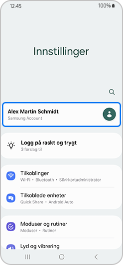 Med en Samsung-konto kan du utnytte fordelene til kunstig intelligens for å gjøre dagen din enklere: for eksempel kan du finne igjen telefonen din hvis du ikke husker hvor du har lagt den, selv om den er slått av, ved å bruke Samsung Find / Finn min mobil – bare logg på kontoen for å få tilgang til alle disse Samsung-appene og -tjenestene. Dette lar deg koble til og administrere enhetene dine og dele innhold enkelt, samtidig som du kan være trygg på at personvernet ditt blir ivaretatt. I tillegg gjør en Samsung-konto det mulig for deg å sikkerhetskopiere, gjenopprette og synkronisere data på tvers av en rekke enheter og gir deg tilgang til eksklusive apper som SmartThings og Samsung Pay.