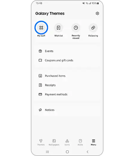 Trykk på “Mine ting” (“My stuff”) og velg bakgrunn-, ikon- eller AOD-kategorien for innholdet du vil ta i bruk.