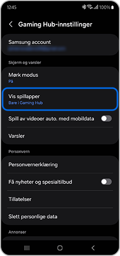 Hvis dine Gaming Hub-tillatelser er satt til “Bare i Gaming Hub” i menyen “Vis spillapper”, så er ikke ikonene for spillene du installerer synlige på skjermbildet Hjem/Apper. Slik endrer du innstillingene for å vise spillikonene dine på skjermbildet Hjem/Apper: