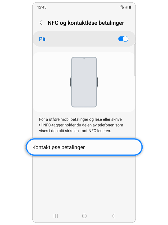 Hvis du vil sjekke plasseringen av NFC-antennen og riktig enhetsplassering, går du til Innstillinger > Tilkoblinger > NFC og kontaktløs betaling og gjennomgår veiledningen og bildet på skjermen.