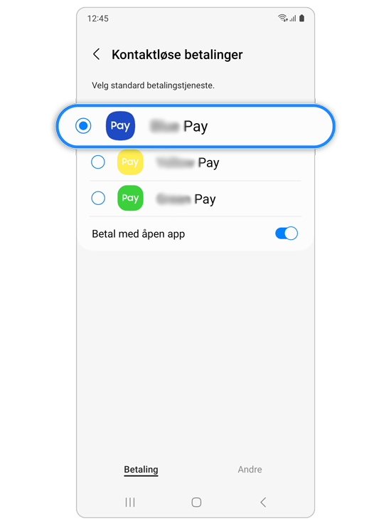 Merk: Du kan også trykke på bryteren ved siden av Betal med åpen app.