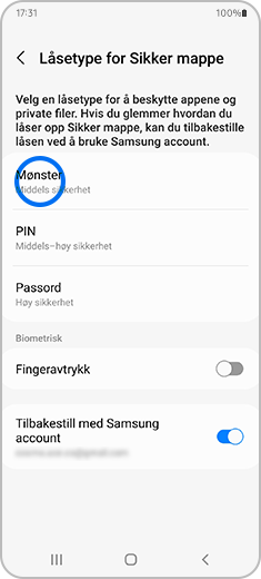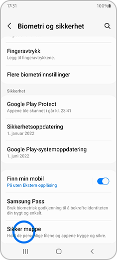 Sikkerheten til innholdet ditt er viktig; derfor har Sikker mappe den høyeste graden av sikkerhet. Mappene dine er beskyttet av Samsung Knox for å sikre at all informasjonen din vernes mot ondsinnede angrep. For å sørge for at dine data forblir så sikre som mulig, kan du også beskytte Sikker mappe med et passord eller en biometrisk lås.