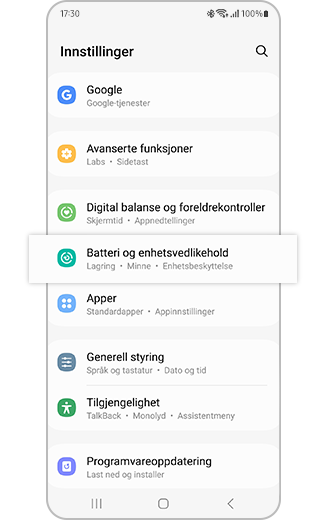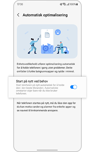 Enhetsvedlikehold utfører automatisk ulike optimaliseringer, som å lukke bakgrunnsapper og rydde i minnet, for at telefonen skal fungere optimalt. Android 13(T) OS (One UI5) har en oppdatert funksjon for automatisk optimalisering som lar deg konfigurere en omstart av telefonen når den ikke er i bruk, slik at den kan fungere optimalt.