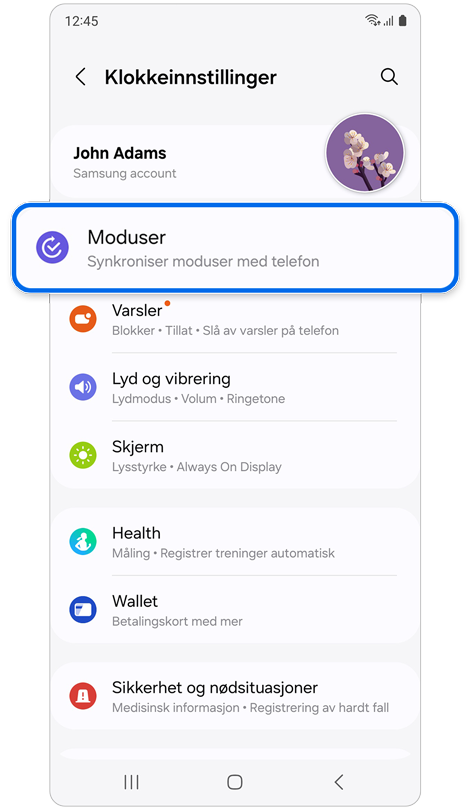 - Modusene for Galaxy Watch som dekkes i denne artikkelen kan stilles inn både fra Galaxy Wearable-appen på telefonen og selve klokken.