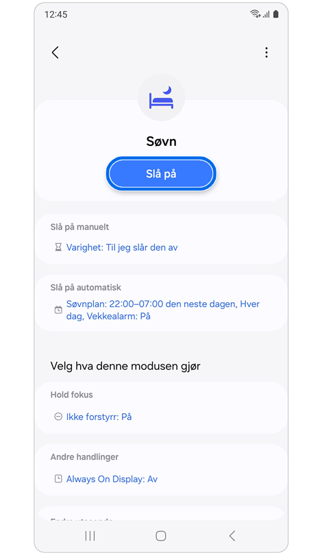 Når du vil slå på modusen: Dra ned for å få tilgang til Hurtiginnstillinger > Trykk på ikonet for Moduser > Velg Søvn.