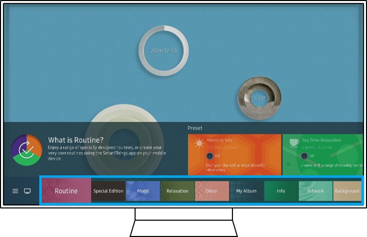 Ambient Mode tilbyr mange nyttige funksjoner som gjør hverdagen mer effektiv og elegant. Du kan få spesifikk informasjon du trenger, få hjelp til total avslapning, endre stemningen i rommet, få ditt eget galleri, og så videre.