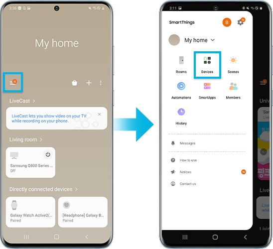 Trinn 1. Start SmartThings-appen, trykk på hovedmenyen, deretter på Enheter for å gå inn i enhetslisten.
