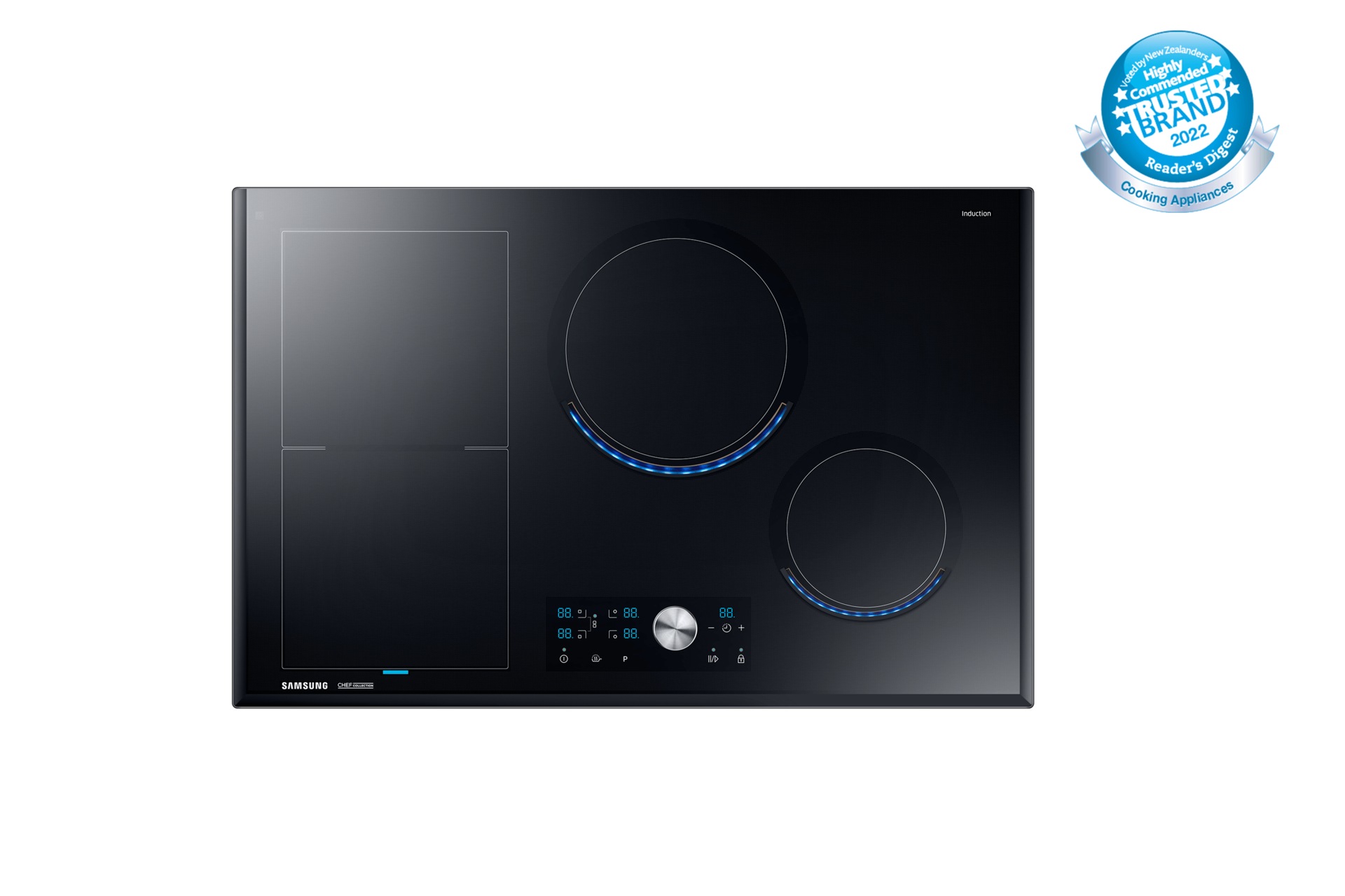 The Samsung Chef Collection Cooktop features a large open area called the Wide Flex Zone, a large, rectangle- shaped open area on the cooktop that is specially designed for cooking multiple dishes. It is wide and spacious enough to accommodate pots and pans of varying shapes and sizes at once, including any large cookware. So it makes cooking large family meals very easy.