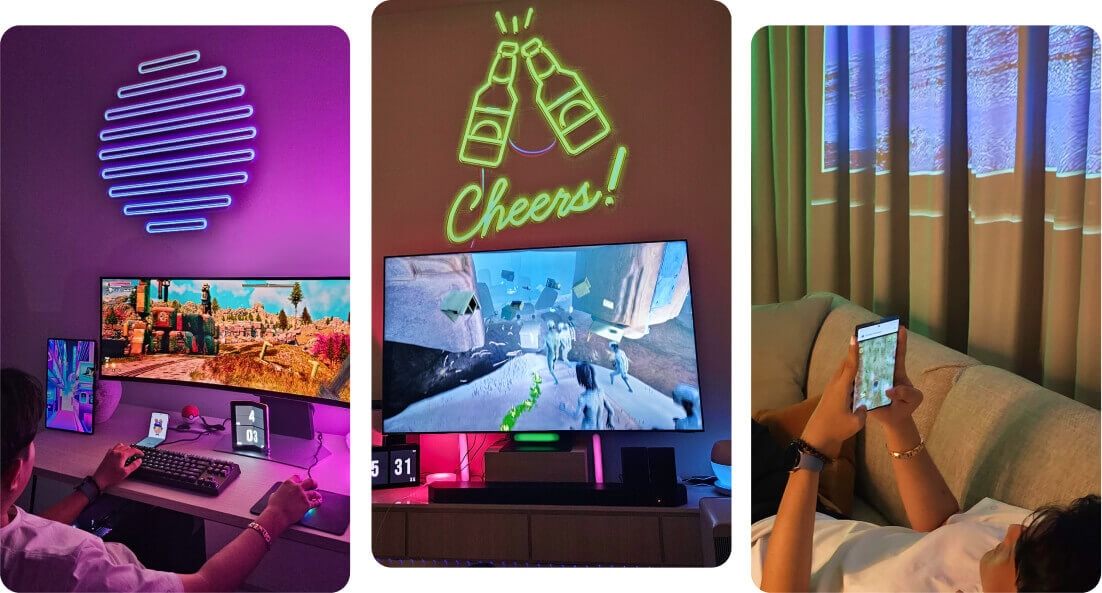 Whether it is a cyberpunk style, as seen in our video, or your favourite photo from a scene of your game, you can use The Freestyle to transform your space just by using the Ambient Mode feature.
