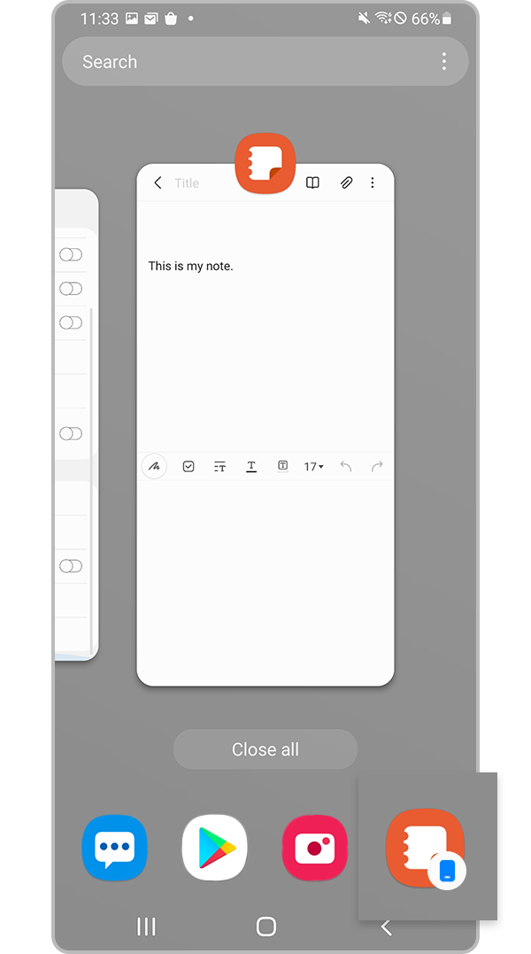 The Continue apps on other devices feature allows you to freely switch between two devices as you use the app. For example, if you're browsing the internet on your phone, but want to continue what you're doing on a tablet's larger display, you can use this feature. Or maybe you're shopping on your tablet and want to switch to your phone for payment. Just tap the icon that appears on the Recents screen with the Continue apps on other devices feature turned on.