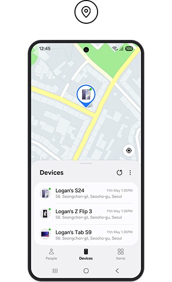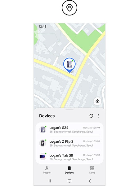 Comprueba el paradero de tu dispositivo Samsung Galaxy en el mapa y recibe instrucciones de navegación precisas. Si pierdes el smartphone y no puedes acceder a la aplicación Samsung Find, prueba localizar tus dispositivos Samsung Galaxy con la aplicación Samsung Find de un familiar, siempre que antes compartido su ubicación contigo. También puedes iniciar sesión en samsungfind.samsung.com.