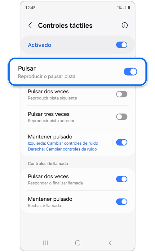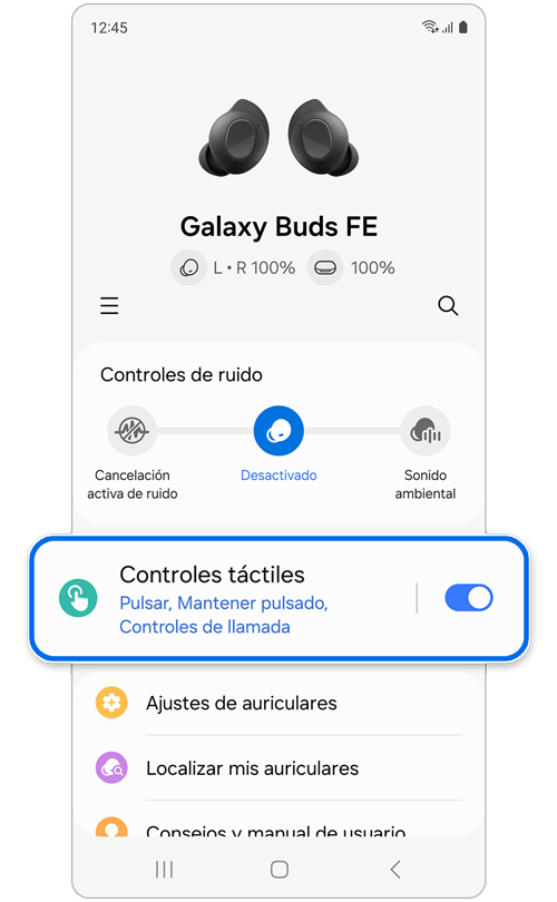Los Galaxy Buds FE cuentan con un área de contacto separada que puede ser tocada involuntariamente al retirar un auricular de tu oído, lo que a su vez puede detener la reproducción de tus medios. Si deseas activar o desactivar la función táctil, sigue estas instrucciones: