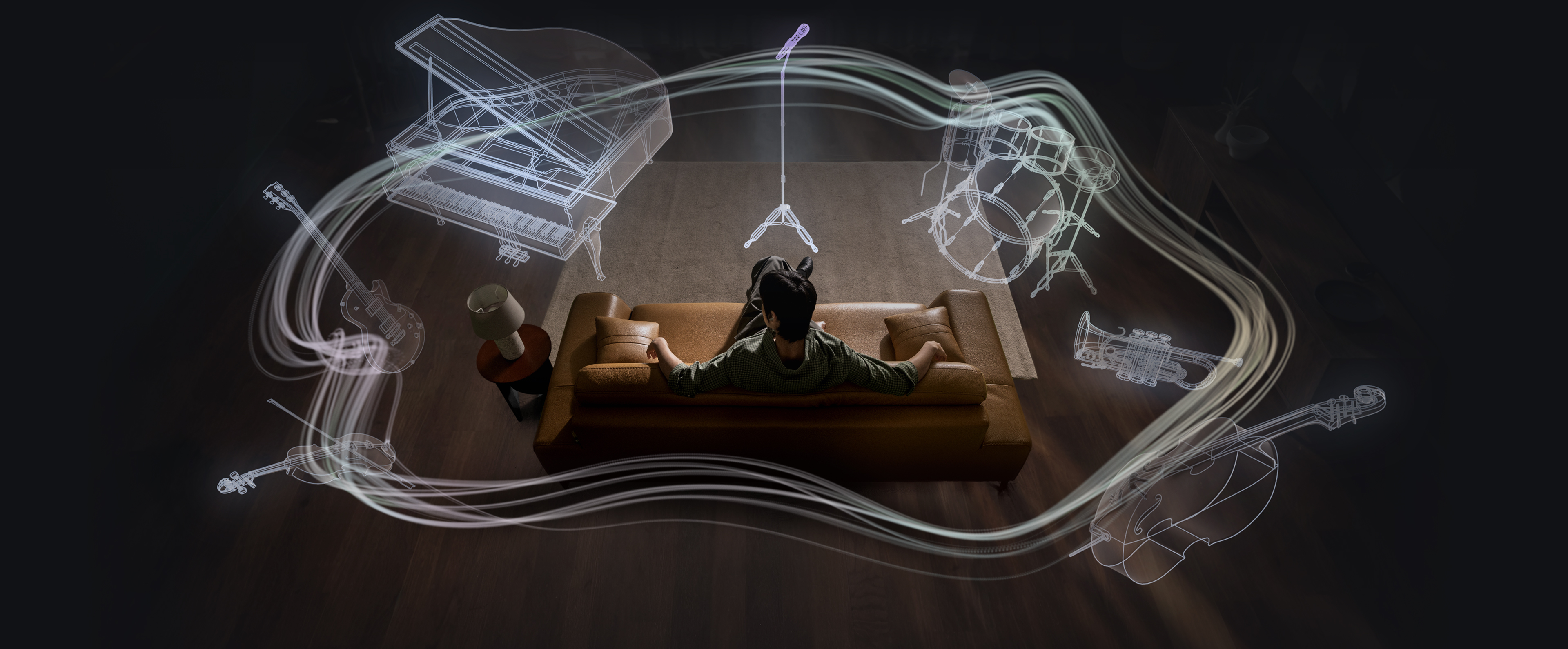 A man sitting on a couch as a collection of instruments appear in a circle around him. The instruments include a mic with a mic stand, a drum set, trumpet, cello, violin, electric guitar and grand piano. The instruments are shown in outline, highlighting the 360 Audio system available on Galaxy Buds4 Pro.