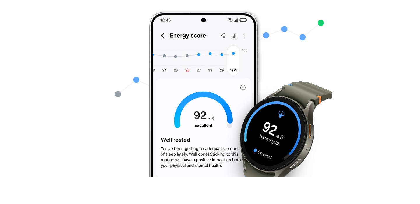 - To check the Energy score, the health data tracked from Samsung Galaxy Watch (Galaxy Watch4 series and later models, excluding Galaxy Fit3) or Samsung Galaxy Ring must be synchronized with the Samsung Health App. Needs at least the previous day’s activity data and sleep, and heart rate data during sleep.