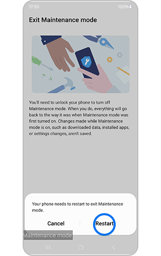 Please note: Once Maintenance mode is active your personal data cannot be accessed, and only pre-installed apps are available.