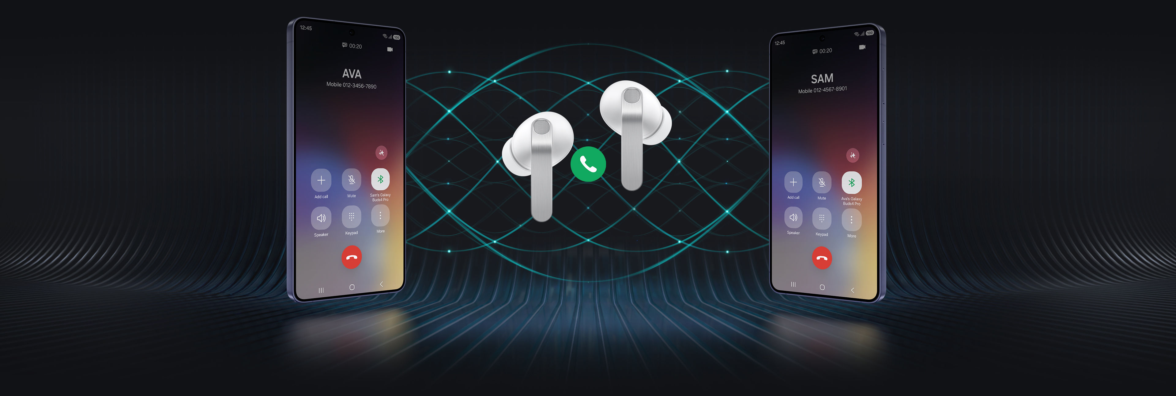 Dwa smartfony Galaxy umieszczone po obu stronach, a między nimi para białych słuchawek Galaxy Buds4 Pro. Między słuchawkami widoczna jest ikona połączenia telefonicznego. Smartfon po lewej stronie pokazuje ekran połączenia z imieniem 'Ania', a smartfon po prawej pokazuje ekran połączenia z imieniem 'Tomek'. W tle widoczne są fale ilustrujące funkcję Super Clear Call dostępną w słuchawkach Galaxy Buds4 Pro.
