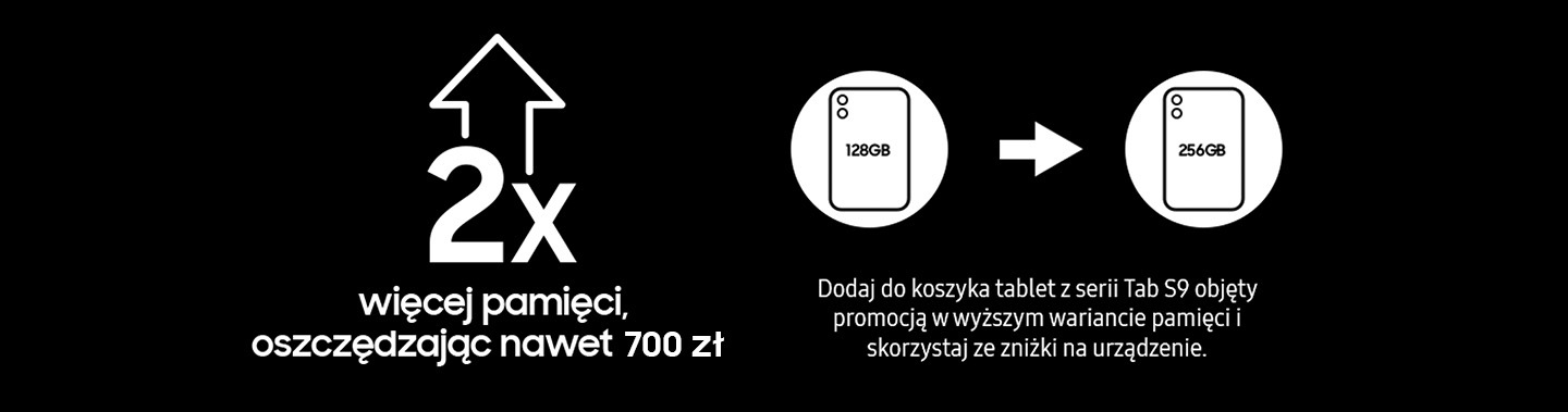 - 1. Oznacza możliwość zakupu tabletu Galaxy Tab S9 Ultra z pamięcią 512 GB z rabatem 700 zł lub tabletu Galaxy Tab S9+ z pamięcią 512 GB z rabatem do 700 zł lub tabletu Galaxy Tab S9 z pamięcią 256 GB z rabatem 700 zł, których wysokość odpowiada różnicy w cenie między modelami z pamięcią odpowiednio 256 GB a 512 GB oraz 128 GB a 256 GB. Galaxy Tab S9 Ultra 1TB można zakupić z rabatem 700 zł. Powyższe kwoty rabatów dot. zakupów na Samsung.pl. Sprawdź również oferty u partnerów handlowych Samsung. Firma Samsung nie ma wpływu na ceny odsprzedaży produktów Samsung, marże lub rabaty, stosowane przez partnerów Samsung, zarówno w sprzedaży regularnej i promocyjnej.