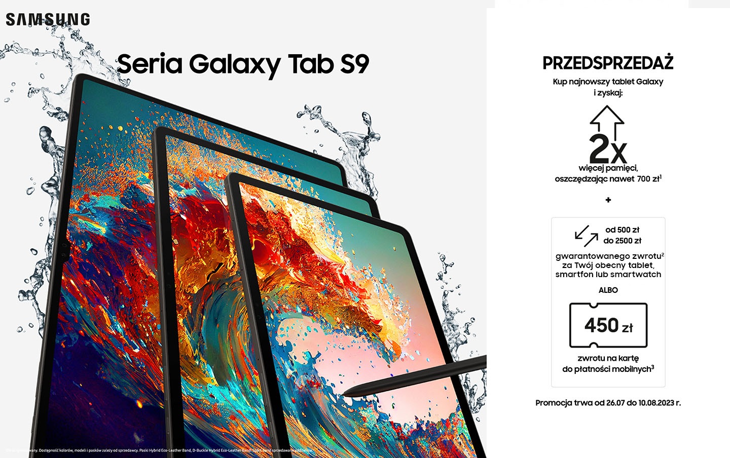 * Oznacza możliwość zakupu tabletu Galaxy Tab9 Ultra z pamięcią 512 GB z rabatem do 700 zł lub tabletu Galaxy Tab S9+ z pamięcią 512 GB z rabatem do 700 zł lub tabletu Galaxy Tab S9 z pamięcią 256 GB z rabatem do 700 zł, których wysokość odpowiada szacunkowej różnicy w cenie między modelami z pamięcią odpowiednio 256 GB a 512 GB oraz 128 GB a 256 GB. Galaxy Tab S9 Ultra 1TB można zakupić z rabatem do 700 zł. Szczegóły i ograniczenia u sprzedawcy.
