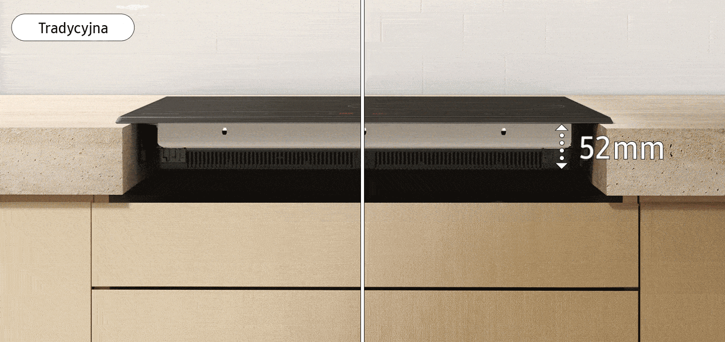 * W porównaniu z modelem NZ63N9777GK/E1. Grubość płyty grzewczej została zmniejszona z 52 mm do 44 mm, a minimalna grubość blatu roboczego została zmniejszona z 20 mm do 10 mm.