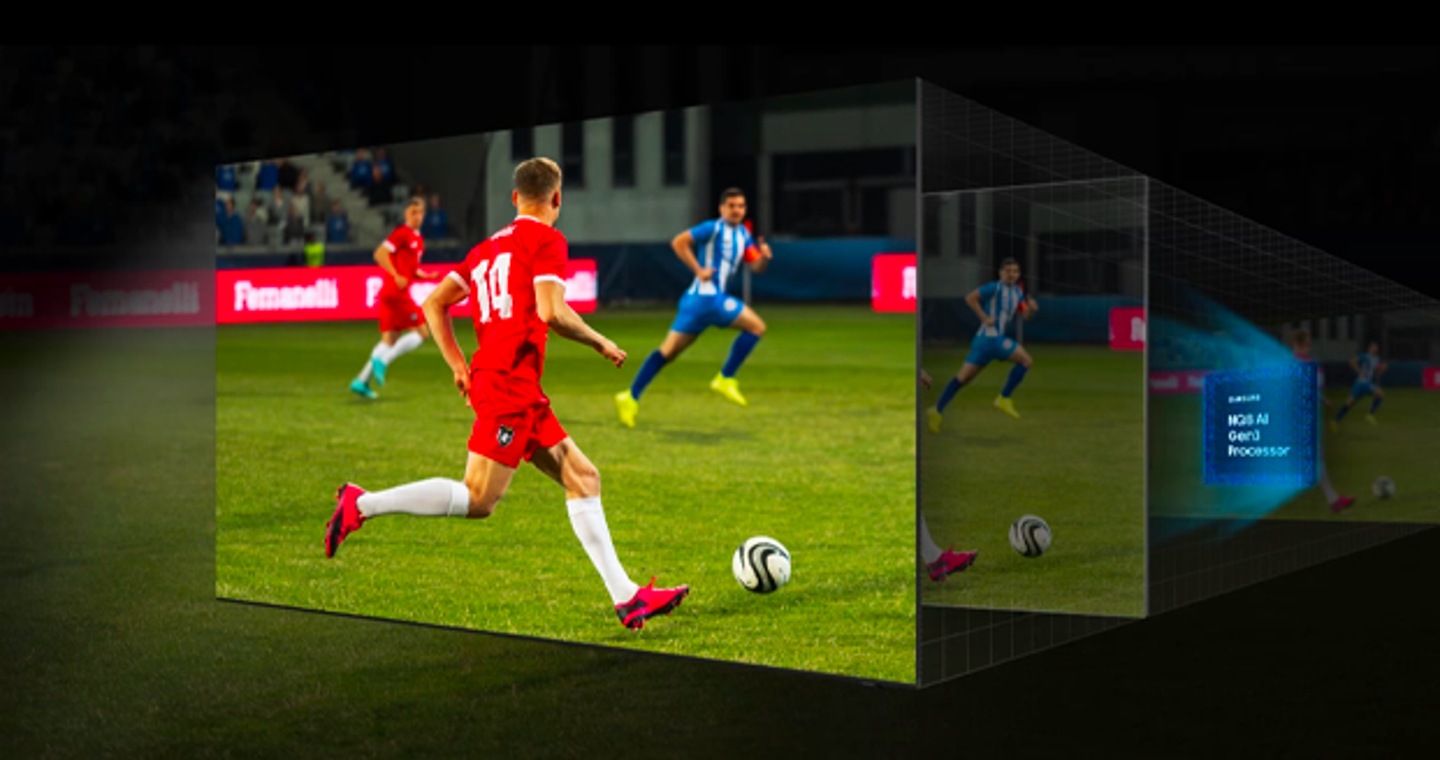 Jak telewizory Samsung upłynniają ruch dzięki AI? Gdy na ekranie dzieje się coś dynamicznego, np. sprint piłkarza, szybki ruch kamery czy przewijający się tekst – procesor analizuje kolejne klatki i wyostrza ruch obiektów oraz napisów. W praktyce oznacza to, że piłka lecąca przez boisko nie zamieni się w rozmazaną smugę, a napisy przewijane podczas wiadomości pozostaną czytelne. Co więcej, Upłynniacz Ruchu AI Pro5 automatycznie rozpoznaje, z jakim rodzajem obrazu ma do czynienia, np. potrafi wykryć konkretną dyscyplinę.