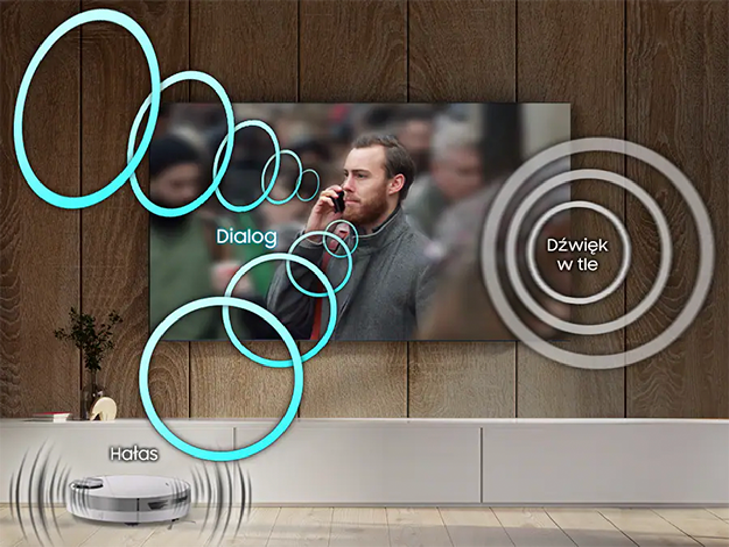 Jak działa adaptacja dźwięku? Telewizory Samsung z AI analizują zarówno sygnał audio programów, jak i odgłosy z zewnątrz. Przykładowo, gdy włączy się odkurzacz. Aktywny Wzmacniacz Głosu Pro6 wykryje dźwięk i inteligentnie podbije głośność dialogów, aby nadal były zrozumiałe. Dzięki AI telewizor jest w stanie separować różne składniki ścieżki dźwiękowej (mowę, muzykę, efekty) i optymalizować je niezależnie. Dodatkowo uwzględnia akustykę pomieszczenia (np. czy pokój jest mały i zamknięty, czy duży i otwarty), aby dostosować ton i przestrzenność brzmienia. W praktyce oznacza to, że każda scena brzmi możliwie najlepiej. Wszystko bez konieczności ręcznego zmieniania ustawień – telewizor sam przełącza tryby i dokonuje korekt.