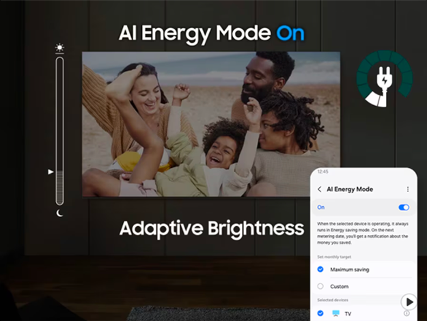 Tryb AI Energy3 to inteligentny tryb oszczędzania energii, w którym telewizor automatycznie reguluje podświetlenie ekranu, aby zmniejszyć pobór prądu – dzięki aplikacji SmartThings7 włączony Tryb AI Energy3 automatycznie wykrywa poziom oświetlenia otoczenia i analizuje zachowania użytkownika, aby dostosować jasność ekranu i zmniejszyć ogólne zużycie energii. Tryb analizuje także wyświetlane treści scena po scenie, aby tam, gdzie to możliwe, subtelnie dostosować jasność i zmniejszyć zużycie energii. Samsung stawia na rozwiązania eko, a sztuczna inteligencja pomaga osiągnąć kompromis między świetnym obrazem a niższym zużyciem energii.