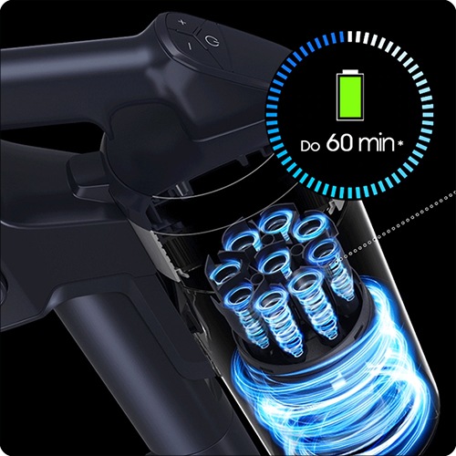 Odkurzacze akumulatorowe Samsung jak np. Samsung Bespoke Jet pracują bardzo wydajnie. Akumulator do odkurzacza jest w stanie zapewnić nawet godzinę pracy na jednym ładowaniu – w praktyce odkurzaj bez przerwy nawet do 60 minut*. Jest to czas, w którym można posprzątać nawet większe mieszkanie. Warto wiedzieć, że Samsung oferuje odkurzacz z wymiennym akumulatorem (z dwiema bateriami). Potrzebujesz wysprzątać większy metraż? Zapewnij sobie nawet do 120 minut nieprzerwanej pracy** i nie zastanawiaj się, ile wytrzymuje akumulator w odkurzaczu.