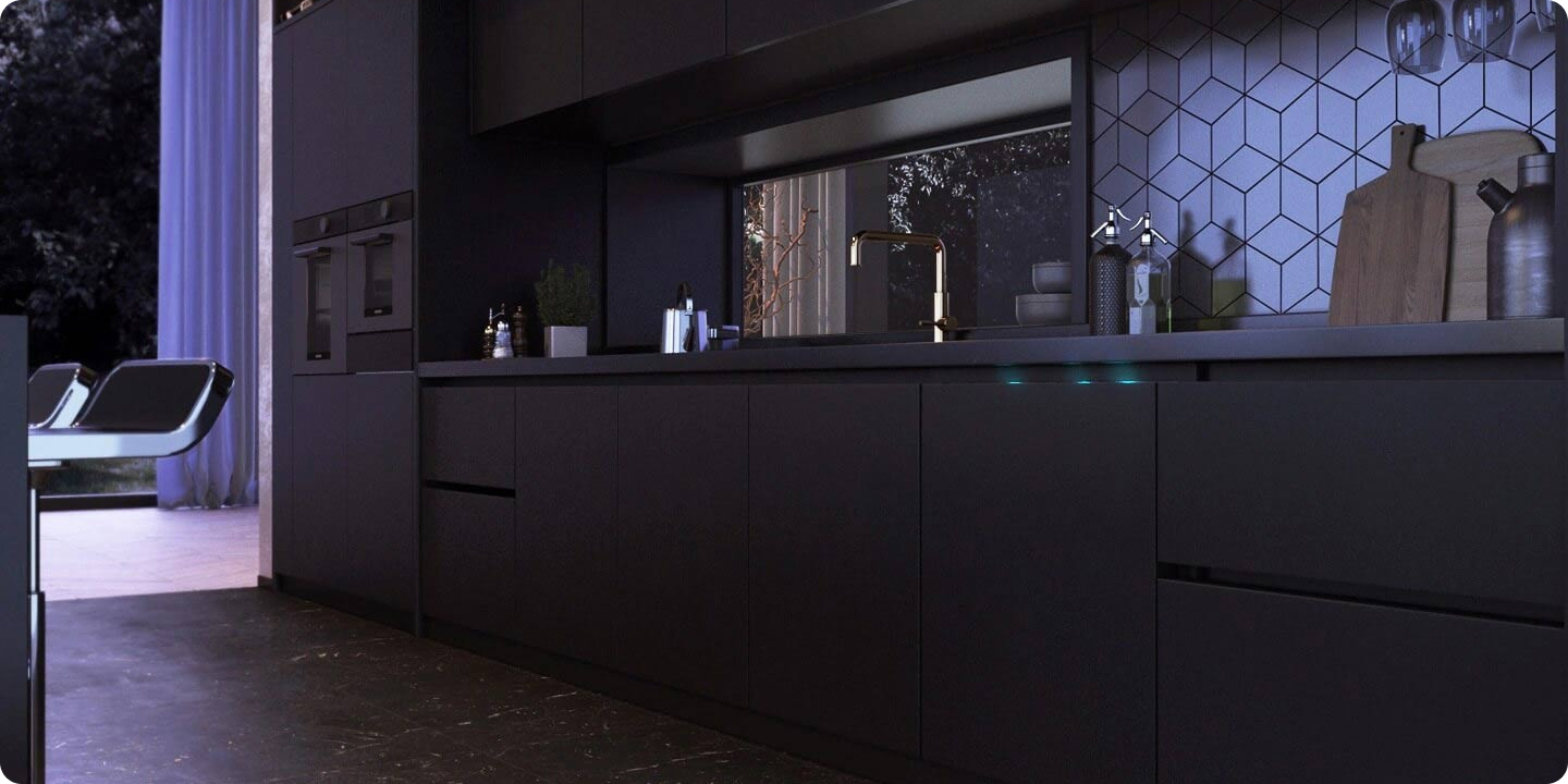 Zmywarki całkowicie wtopione w linię mebli są niewidoczne. Zmywarka Samsung do zabudowy z ukrytym panelem sterującym zgrabnie wtapia się w tło. Front mebla kuchennego jest zamontowany na drzwiach zmywarki, dlatego zmywarka wygląda jak pozostałe meble kuchenne w zabudowie, a elementy sterowania i wyświetlacze umieszczone są w górnej krawędzi drzwi. Po załadowaniu komory i wybraniu programu cykl mycia rusza dopiero wraz z domknięciem drzwi. Po zamknięciu lokalizację urządzenia może zdradzić tylko sygnał świetlny emitowany podczas pracy na podłodze (opcja dostępna w wybranych modelach).