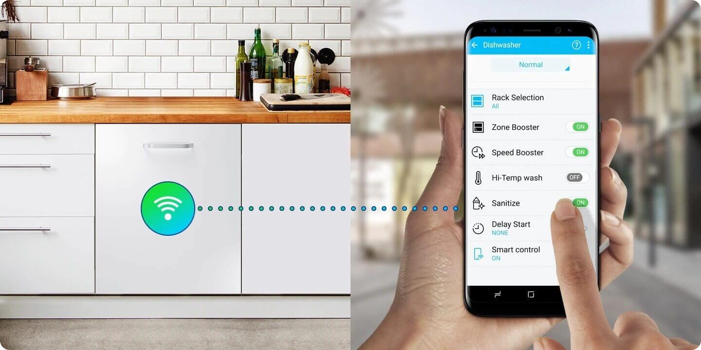 Niektóre zmywarki można podłączyć do Wi-Fi i z ekranu smartfona zarządzać ich ustawieniami. Dzięki aplikacji SmartThings z telefonu zaprogramujesz, jaki program uruchomić i kiedy zacznie się zmywanie***. Pozwoli Ci to włączyć załadowane urządzenia bez odrywania się od ulubionego serialu lub ustawić zmywarkę na godzinę nocną, kiedy obowiązują lepsze taryfy opłat za energię. Na telefon otrzymasz też powiadomienie o kończącym się detergencie oraz przypomnienie o przeprowadzeniu samooczyszczenia zmywarki.