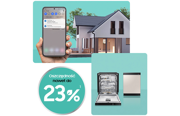 Podczas zmywania naczyń w zmywarce zużywa się średnio około 3 razy mniej wody niż przy zmywaniu ręcznym, ale… Wyobraź sobie, że zmywarki Samsung pozwolą Ci oszczędzić jeszcze więcej! I to nie tylko wody, ale przede wszystkim energii elektrycznej. W połączeniu z aplikacją SmartThings* i AI Energy Mode zauważalnie zmniejszą zużycie mediów w Twoim gospodarstwie domowym.