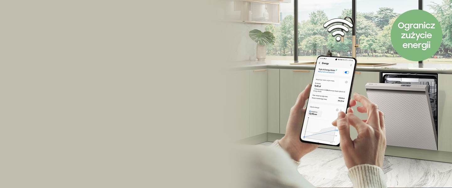 AI Energy Mode to tryb oszczędzania energii, który można aktywować z poziomu aplikacji Samsung SmartThings w zakładce Energy. To rozwiązanie pozwoli Ci kontrolować pobór energii i zmniejszyć zużycie prądu nawet o 23%**. To z kolei, w zależności od wybranego cyklu, pozwoli Ci obniżyć temperaturę zmywania z 63 do 55 stopni Celsjusza.