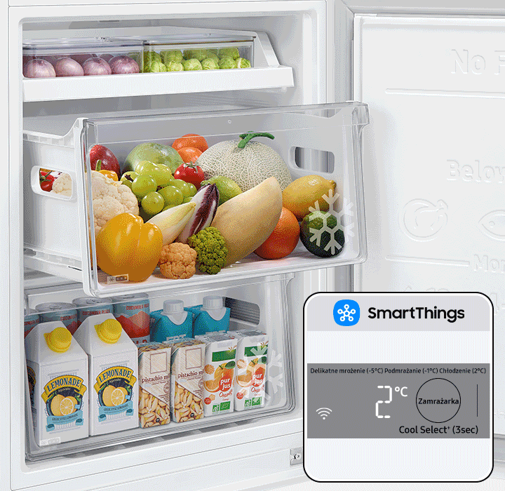 Strefa Cool Select+ pozwala dostosować lodówkę do aktualnych potrzeb dzięki możliwości dopasowania temperatury w zamrażalniku do konkretnego rodzaju żywności. Można zmienić zamrażalnik w chłodziarkę, jeśli jest taka potrzeba żeby przechować większe zakupy albo wybrać tryb schładzania czy lekkiego mrożenia. Wystarczy wybrać Chłodzenie (2°C), Podmrażanie (-1°C), Delikatne mrożenie (-5°C) lub Mrożenie (-15-23°C), aby dostosować je do swoich potrzeb.