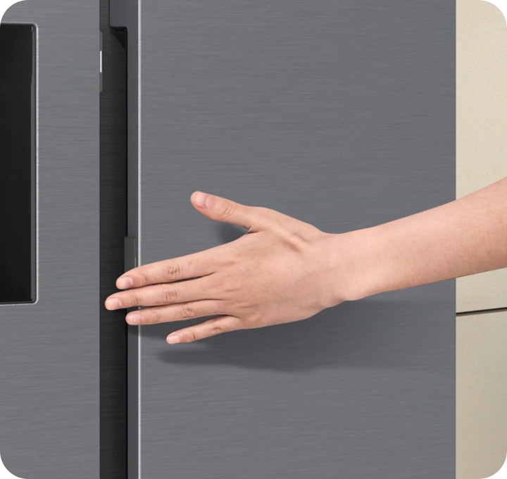 Otwieraj lodówkę bez wysiłku! Funkcja automatycznego otwierania drzwi wykorzystuje czujniki umieszczone po obu stronach, które umożliwiają Ci otwarcie drzwi* za pomocą delikatnego dotknięcia. Podświetlenie czujników jest zawsze włączone, co ułatwia ich znalezienie nawet w ciemności, a wydawany przez nie dźwięk ostrzega, gdy drzwi się otwierają. Umożliwia to wygodny dostęp do produktów i ułatwia ich wyjmowanie. Dodatkowo, dzięki braku wystających uchwytów, lodówka ma stylowy i jednolity wygląd.