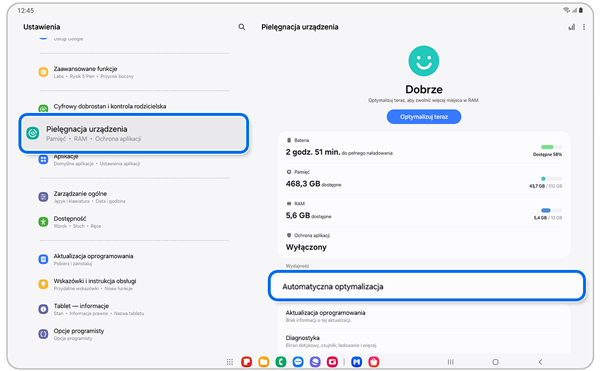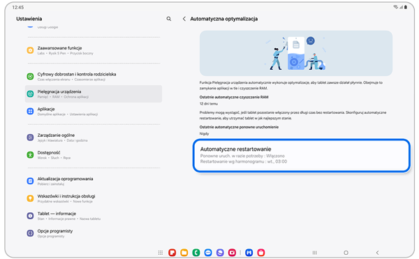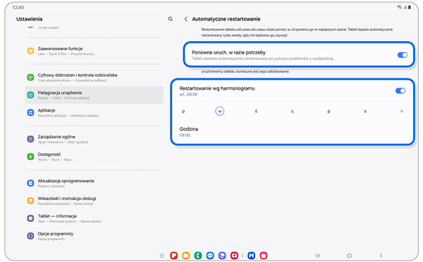 Funkcja automatycznego ponownego uruchamiania pomaga utrzymać tablet Samsung Galaxy w dobrym stanie, regularnie go restartując. Może być włączana i wyłączana w razie potrzeby i będzie restartować urządzenie tylko wtedy, gdy tablet nie jest używany.