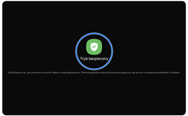 Tryb bezpieczny pozwala uruchomić tablet, wyłączając wszystkie wcześniej zainstalowane aplikacje firm trzecich. W ten sposób aktywne będą tylko standardowe aplikacje Samsung, co pozwala ustalić, które aplikacje powodują problemy z urządzeniem.