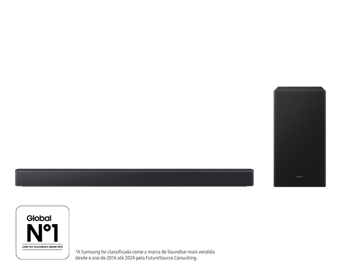 *Disponível em TVs Samsung compatíveis com Bluetooth.*Imagem simulada para efeitos ilustrativos.*Para funcionar, cada componente requer um cabo de alimentação separado. As especificações de estética e design não afetam o desempenho do produto e podem ser alteradas sem aviso prévio. *O produto real pode ser diferente daquele que se vê na imagem. Por favor, consulte a nossa galeria de produto.