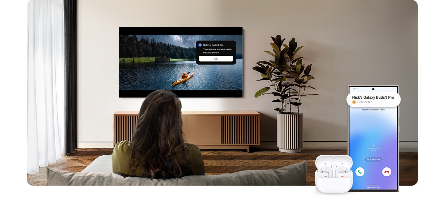 Se estiver a ver um filme no seu Galaxy Tab com os seus Galaxy Buds e, de repente, receber uma chamada, não há problema. Com a funcionalidade Auto Switch, conseguirá conectar os Galaxy Buds automaticamente ao seu smartphone para que possa atender a chamada instantaneamente. Quando a chamada acabar, o som do filme continuará. 19