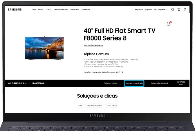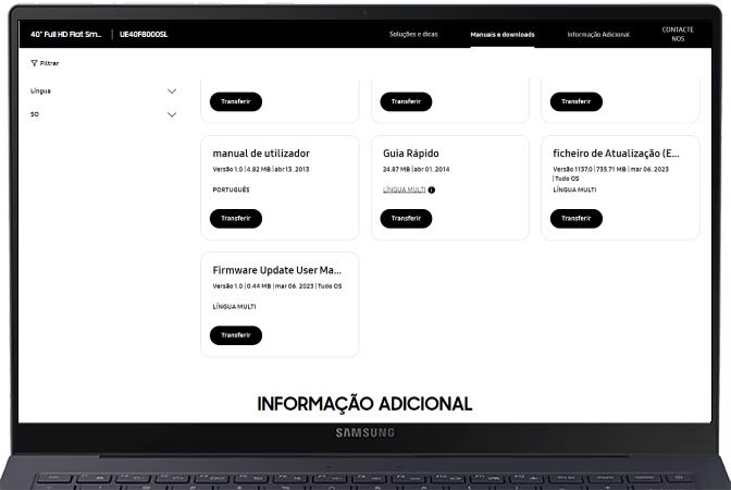 Depois de aceder ao modelo, clique em “Manuais e downloads”.