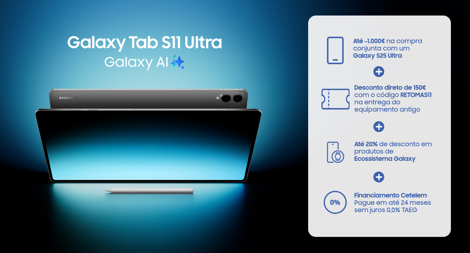 • Na retoma do seu equipamento antigo, consiga 150 € de desconto no Galaxy Tab S11 Ultra ou 100 € no Galaxy Tab S11 , com o código RETOMAS11