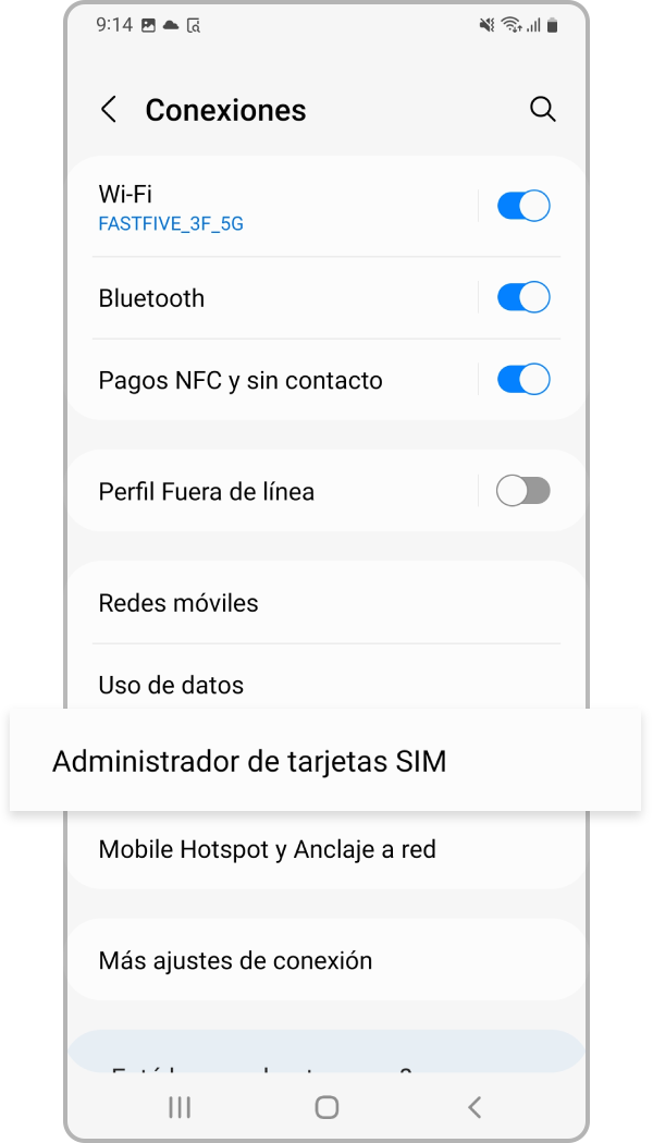 Puedes personalizar los ajustes de la tarjeta SIM y activar o desactivar las tarjetas SIM instaladas en el menú del administrador de tarjetas SIM. Inicia la aplicación Ajustes y toca Conexiones > Administrador de tarjetas SIM.