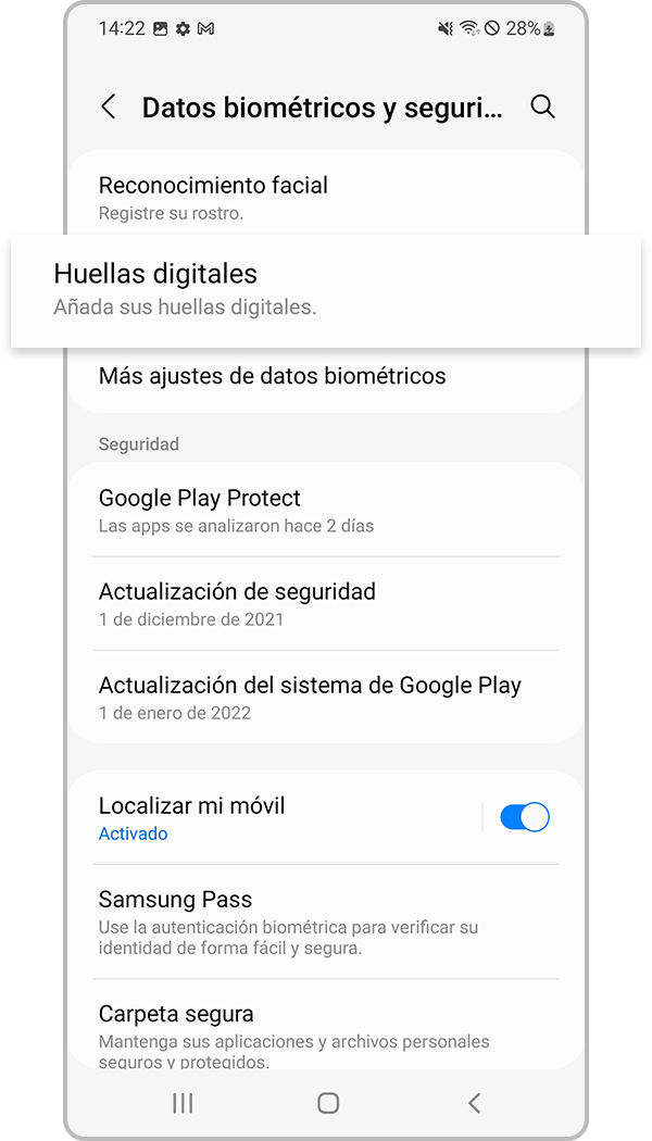 Paso 1. En la pantalla Ajustes, toca Datos biométricos y seguridad > Huellas digitales.