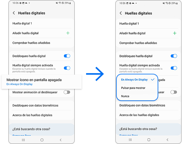 Configura el dispositivo para que muestre u oculte el icono de reconocimiento de huellas digitales cuando tocas la pantalla mientras está apagada.
