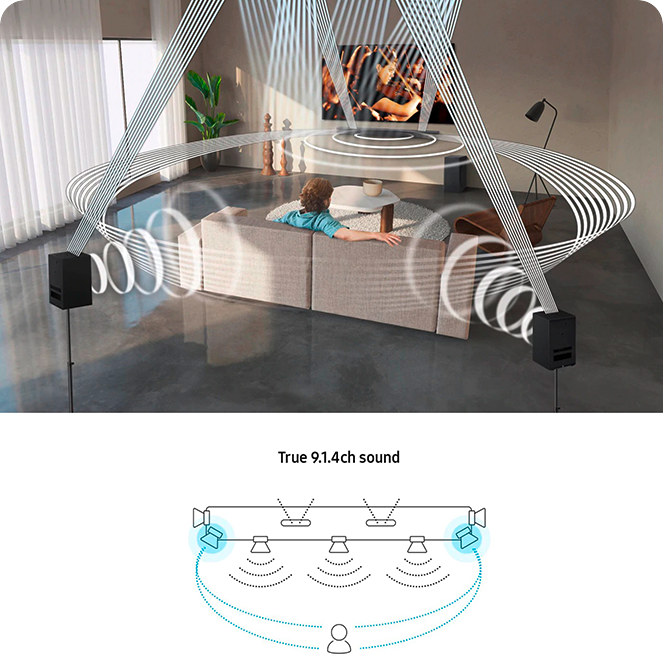 Difuzoarele QLED TV se sincronizează în armonie cu soundbar-ul Samsung. Conectează-te și bucură-te de o experiență de sunet surround integrat, mai viu, cu efecte optimizate pentru fiecare tip de sunet cum ar fi filme, muzică și voce.