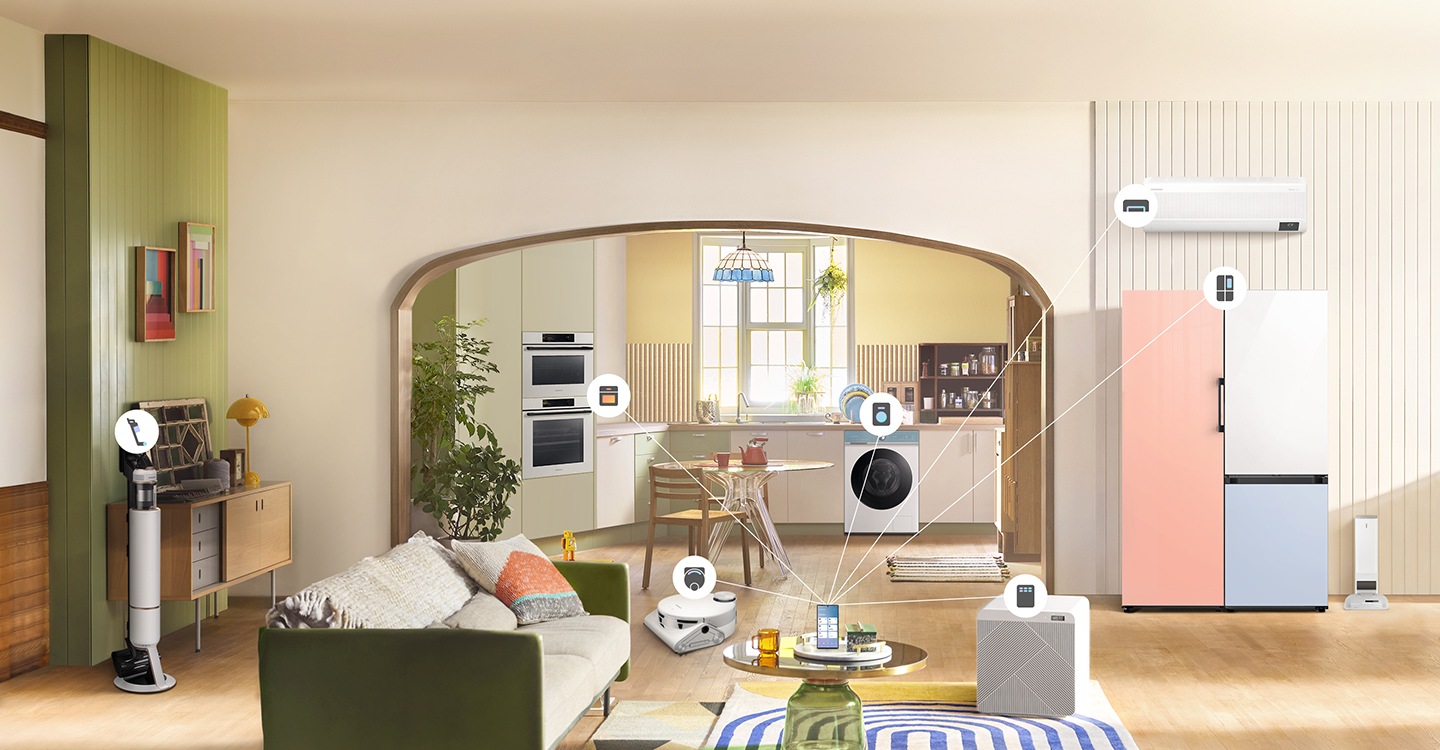 * Toate dispozitivele trebuie să fie conectate la Wi-Fi sau la altă rețea fără fir și înregistrate cu un singur cont Samsung.