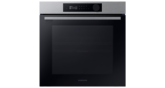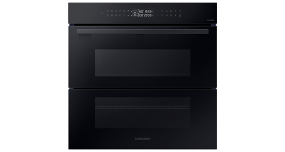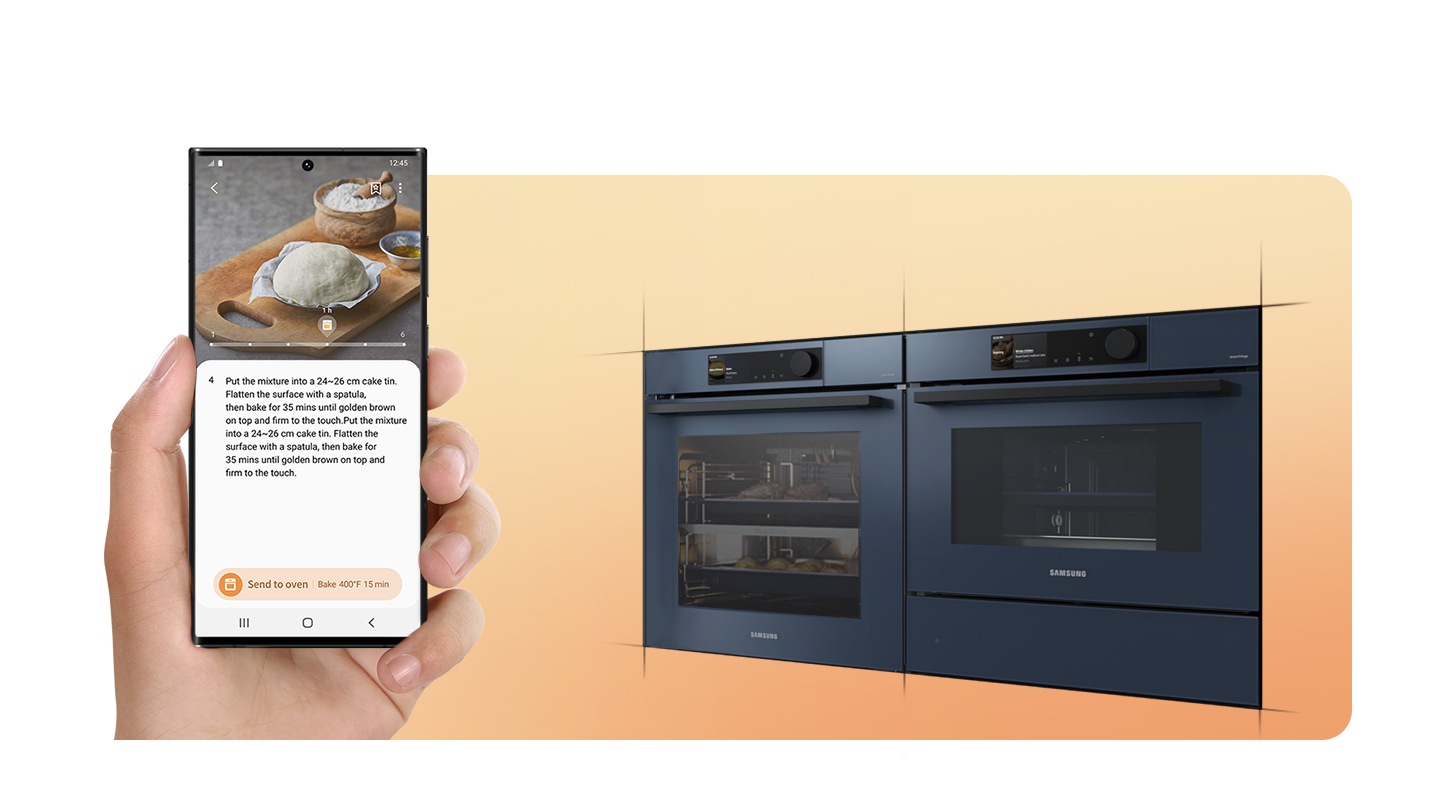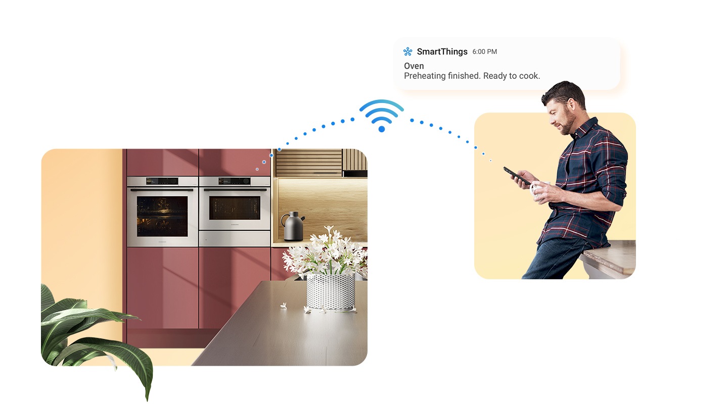 'Un cuptor electric de culoare bej și un cuptor compact sunt pornite în modul preîncălzire. În dreapta, un bărbat se uită la smartphone-ul său și ține în mână o ceașcă de cafea. Un simbol wi-fi conectează cuptorul și smartphone-ul, indicând faptul că acestea sunt conectate și că bărbatul a primit o notificare de la SmartThings, care îl avertizează că preîncălzirea cuptorului s-a terminat.