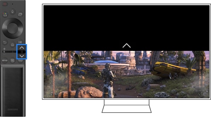 Când utilizezi Ultra wide (21:9 sau 32:9), poți apăsa butonul direcțional sus/jos de pe telecomanda televizorului, pentru a deplasa ecranul în sus sau în jos.