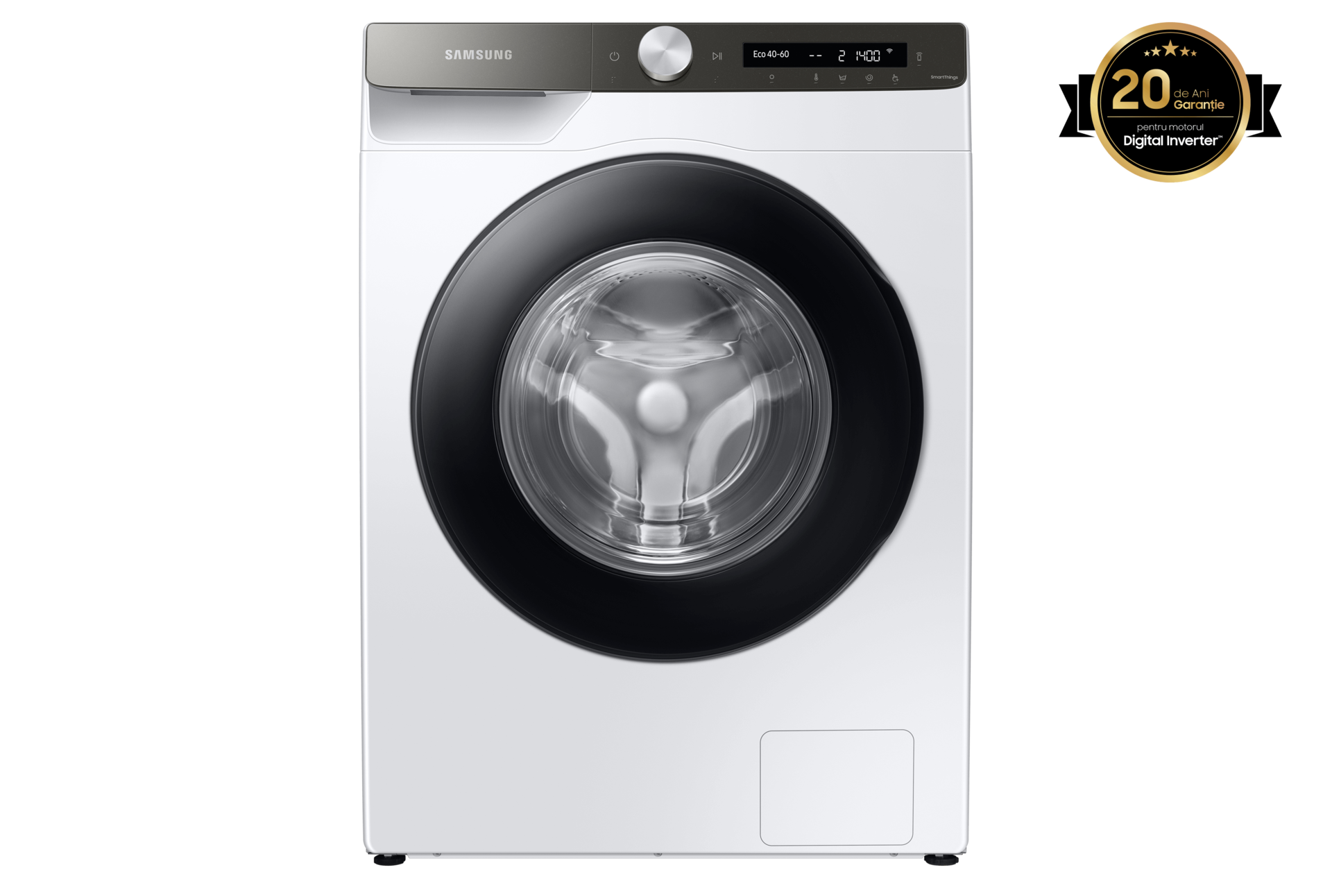 * În general, nivelul de reducere al zgomotului este de 5dBA și 3dBA pentru programele de spălare și de centrifugare. Datele se bazează pe eticheta ERP, F500 în analiza comparativă între modelul WF80F5E5P4W 8kg 1400rpm, cu un motor Digital Inverter și modelul WF1804WPC 8kg 1400rpm cu un motor universal. *** Datele din luna mai 2022. Garanția de 20 de ani, pentru piese, se aplică numai motorului inverter.