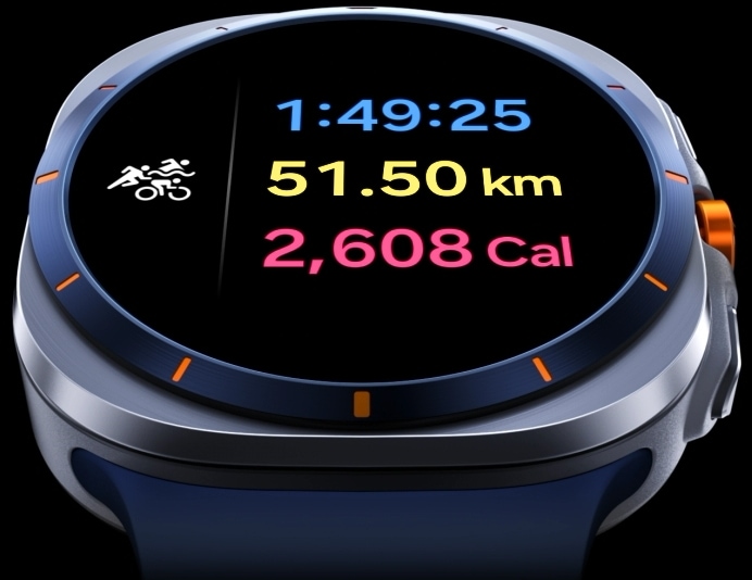 A slightly tilted view of Galaxy Watch Ultra. Power saving mode is selected. Triathlon tracking feature is onscreen. The total amount of time spent exercising goes up from 1 hour 49 minutes 23 seconds to 25 seconds. Distance is 51.50 kilometers. Calories burned go up from 2604 calories to 2608 calories.