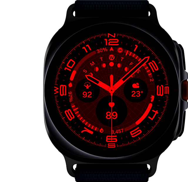 A Galaxy Watch Ultra is seen in daylight. As night falls and the sky turns dark, the Night Mode watch face glows on the watch screen.